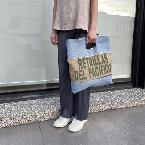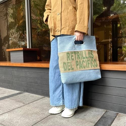 這次改造的丹寧麻布托特包,正面是回收的生豆咖啡麻布袋,背面與內裡是二手丹寧褲,托特包的製作是雙層的,就連提帶也是,所以不用擔心載重的問題。包包的背面有牛仔褲拆下的口袋,內裡也有一個大口袋。整體造型簡約又不失設計感。